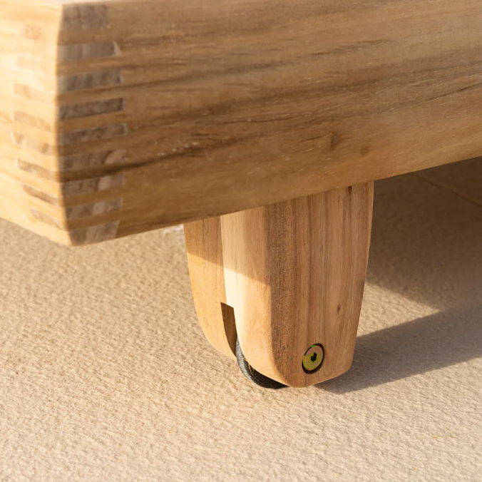 The slatted teak base sits on rounded legs with discreet hidden wheels, making it easy to move as the day changes. Morning light on the terrace, afternoon warmth by the pool. Here’s the thing, it moves with you, not the other way around.