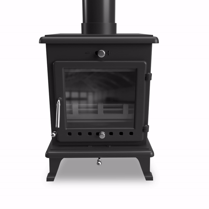 A compact 5kW multi fuel cast iron stove offering high efficiency, ultra clean burning, and DEFRA approval, ideal for small to medium spaces.